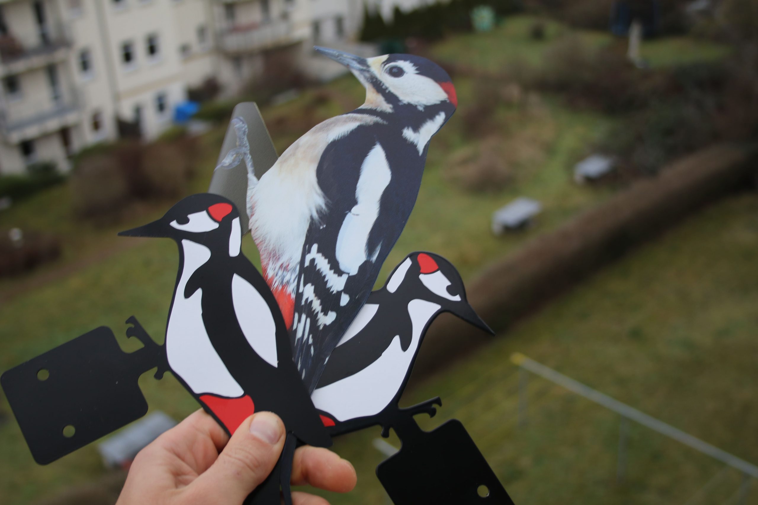 Spechtimitate an den betroffenen Fassaden verringern des Risiko eines Neubefalls. Spechte sind als Reviertiere bekannt und meiden Konkurenten. Je nach Art des Befalls nutzen wir dabei ein oder mehrere Spechtattrappen.